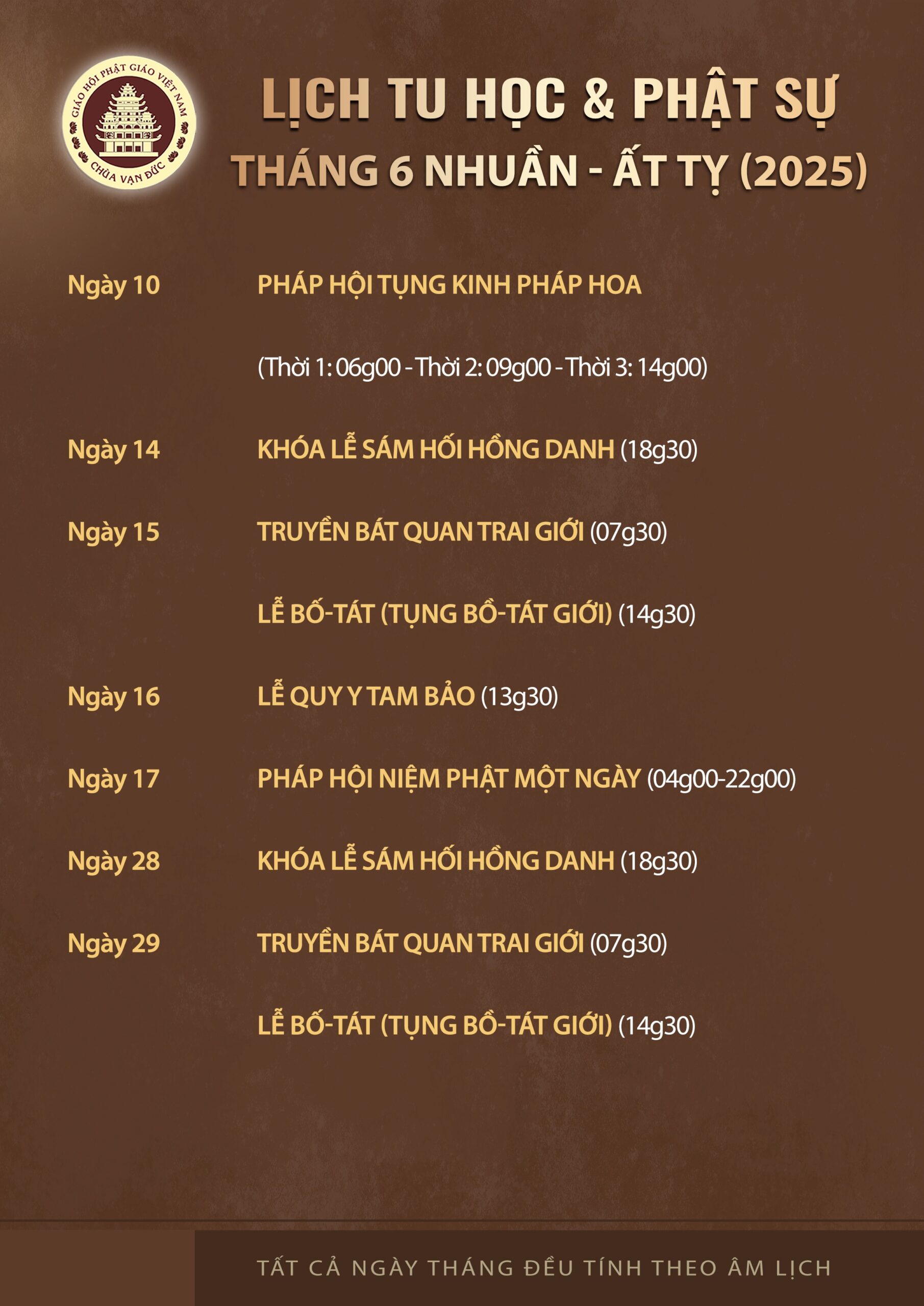LỊCH TU HỌC & PHẬT SỰ THÁNG 6N – ẤT TỴ 2025 TIN CÙNG CHUYÊN MỤC LỄ PHÓNG SANH ĐẦU NĂM MẬU TUẤT 2018 ĐẠO TRÀNG VẠN ĐỨC THAM DỰ PHÁP HỘI TẠI VIỆT NAM QUỐC TỰ 06-01 MẬU TUẤT LỄ HÚY KỴ TỔ SƯ CHÍ THIỀN, KHỞI CÔNG TRÙNG TU TỔ ĐÌNH PHI LAI